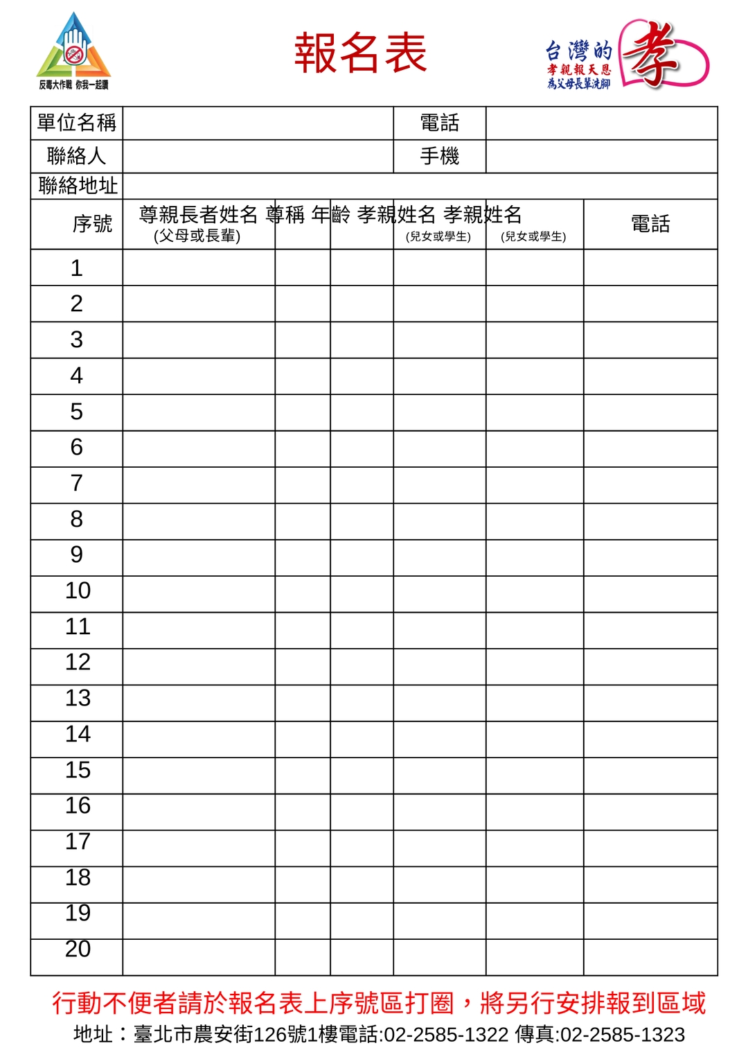 • 參加資格:子女陪同尊親長者一同參與(每20組為一團體報名)